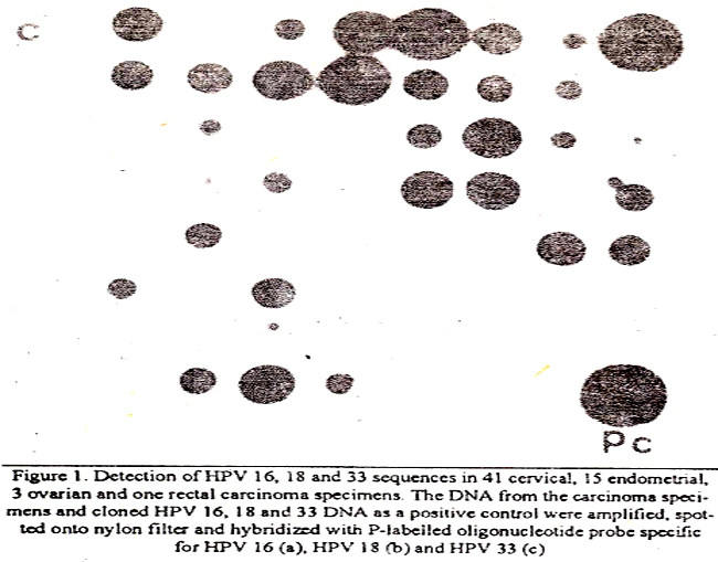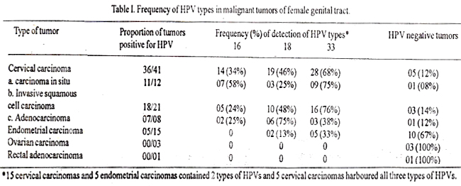 HPV are associated with benign and malignant lesions of aero- digestive and ano-genital tract1. High risk HPV 16,18 and 33 have been consistently found in cervical, vulval and vaginal malignancies1, beside their occasional and controversial presence in the higher female genital tract, like endometrium and ovary2-5. In most of the tumors HPV DNA is integrated and this phenomenon results in the deletion of large regions of the virus, but consistently leaves theE6 and E7 open reading frame intact6. Furthermore, E6 and E7 genes of high risk }{PV have been shown to immortalize human foreskin, cervical keratinocytes and even epithelial breast cells in tissue culture6. More recently it has been demonstrated that the.E6 and E7 gene products from high risk HPV bind p53 and p105-RB tumor suppressor gene products respectively6.