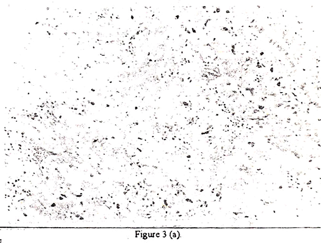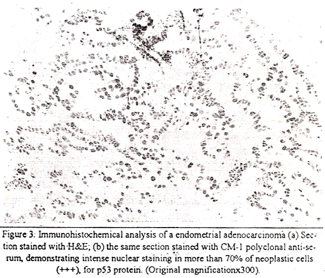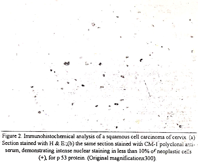 Alter washes, filters were dried and exposed to XAR film (Eastman Kodak Company, Rochester, NY) at -70°C for 1-12h. p53 staining was performed using a polyclonal antibody to p53 (CM 1) and a 3-layered immunoperoxidase method10,13. Briefly, 3-5 um thick sections from• paraffin blocks were dewaxed and after blocking endogenous petoxidase activity with 0.3% hydrogen peroxide and non-specific binding with 20% normal goat serum, these sections were incubated overnight at 4°C with the CM-i antiserum at the dilution of 1:1000. Biotinylated antirabbit imrnunoglobulins were followed by peroxidase-labelled streptavidin The chromagen was osrnicated diaminobenzidine. The intensity and pattern of p53 iinmunostaining were tabulated according to criteria reported by Midgley et al. 13; +++, more than 70% of tumor nuclei intensely stained; ++, between 10 and 70% tumor nuclei intensely stained; +, less than 10% of tumor nuclei intensely stained/or a variable number of tumor nuclei faintly stained; -, tumor nuclei unstained. Positive control comprised paraffin embedded specimen of a colon carcinoma previously shown to express p53 gene with activating point mutation and negative control consisted of replacement of the primaiy antibody with buffer/non-immune rabbit serum.