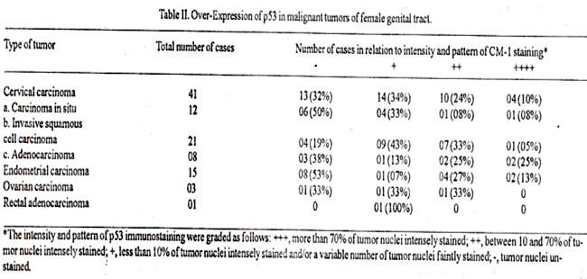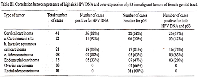 We could detect overexpression of p53 in 68% of cervical carcinoma, 47% of endometrial carcinoma, 2 (of 3) malignant epithelial ovarian tumors and I (of 1) rectal adenocarcinoma. These figures are in accordance with the recent studies indicating presence of p53 alterations in 62% of invasive squamous cell carcinoma of cervix and 11% of cervical adenocarcinoma16. 21% of endometrial carcinoma17 and more than 50% of ovarian carcinoma18. . Previous studies have shown that there is inverse relation between the presence of high risk HPV DNA sequences and p53 mutation in a series of primary cervical carcinoma8 and cervical cell lines7. However, in our study this correlation could not be substantiated. On the contrary, 26 cervical and 3 endometrial carcinoma cases were found positive for these two parameters. These results are similar to one recent study indicating presence of p53 overexpression in 59% of HPV positive cervical carcinomas. Similar results were observed in one of our previous study, in which variable p53 over-expression was detected in 69% of HPV positive laryngeal carcinomas10. These findings suggest the possibility of secondary HPV infection in these carcinoma cases which already have p53 mutations or there may be heterozygosity of the tumor cells for harbouring HPV and p53 mutation. Likewise, there can be stabilization of p53 in these HPV infected cases by preferential complex formation with unknown protein specifically expressed by the tumor cells or there may be failure of ubiquitin mediated proteolysis. Crook and Vousen19 have reported low frequency of p53 formation in primary cervical carcinomas with metastasis, but in our present study this was not the case. All of the cervical and endometrial carcinomas positive for both HPV DNA and p53 over-expression were non-metastatic. Lo et al20 have reported presence of p53 mutation in cervical carcinomas infected with HPV33, but in this series the presence of p53 over-xpression was equally distributed in cases infected with HPV 16, 18 and 33. However, out of six cervical and endornetrial malignant tumors revealing highest expression of p53 (+++), only three harboured HPV 33 and one was HPV negative. Ourfindings suggest that HPV infection is also common in endometrial carcinomas beside cervical malignancy. Moreover, there is no inverse correlation between HPV infection and presence of p53 mutation detected by immunohistochemistry.