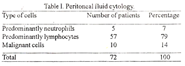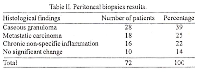 A total of 72 patients were subjected to peritoneal biopsy of which 43 were females and 29 males. The age ranged from 18 to 65 years with a mean of 44 years. All fluids were exudative and 10 of them showed malignant cells. Peritoneal tissue was obtained in all 72 cases. Twenty-eight (3 9%) cases showed caseating granuloma suggestive of tuberculosis, 18 (25%) metastatic carcinoma, 16 (22%) non-specific inflammation and 10 (14%) cases did not reveal any change in the peritoneum. Results of the type of cells and malignant cells in the fluid are tabulated in