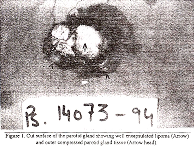 Lipomas are the most common neoplasms of mesenchymal origin. These are benign, encapsulated fatty tumors which may arise in any location where fat is normally present. The majority are subcutaneous and generally found on extremities, trunk and neck regions. The lipomas of the deep tissue are rare and often detected at a relatively later stage of development. These have been described in various sites including anterior mediastinum, chest wall, retroperitoncurn, paratesticular region and intraosseaus etc. The parotid swelling, whether unilateral orbilateral is not an uncommon clinical presentation seen in patients of all ages. Many neoplastic and non-neopiastic causes of parotid gland enlargement have been described1. The majority of the parotid gland tumors are benign and largely represented by the benign mixed tumors2. The lipoma of the salivary glands is rarely seen and the majority are described in the parotid gland region3 and only few cases are reported in the literature4-8. Occasional cases of hibernoma and lipoblastoma in an infant have also been reported in the parotid gland region9,10. Being a rare neoplasm, the diagnosis of lipoma is seldom suspected on clinical examination. There is no reliable method of establishing a preoperative diagnosis of lipoma of salivary glands. The imaging studies including ultrasonography and computed tomography have not proven valuable for establishing the diagnosis. Tumors of the parotid gland can be delineated accurately with CT scan, however; it cannot accurately differentiate between benign and malignant parotid neoplasms. The features which favour a malignant parotid lesion on CT scan are ill-defined margins, local invasion, diffuse spread throughout the gland and enlarged regional lymph nodes. However, some of these features have also been seen in benign ns11,12. The extensive use of fine needle aspiration cytology is an important diagnostic technique in readily accessible parotid gland lesions13. The diagnosis of a lipomatous lesion can be made reliable by this technique if one keeps in mind the possibility of lipoma in differential diagnosis of parotid gland swelling. As a conclusion1 this lesion should be included as a rare possibility in the differential diagnosis of tumors involving the parotid gland.