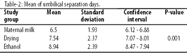 The mean of umbilical separation time had significant differences among the three groups (p <0.0001). The lowest and the highest separation times belonged to human milk and ethanol groups respectively. Among the neonates, the lowest and the highest umbilicus separation times were 3 and 15 days. In post hoc analysis, umbilical separation time in human milk group had significant differences with ethanol (p <0.0001) and drying groups (p <0.003), (Table-2).