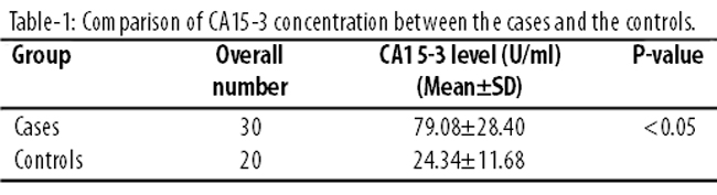 A significantly higher serum CA15-3 level was seen in the cases (79.15±27.54U/ml) than the controls (24.34± 11.68U/ml) (p<0.05) (Table-1).