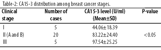 A statistically significant (p<0.05) increase was noticed in CA15-3 values across breast cancer stages; from stage I to stage III (Table-2).
