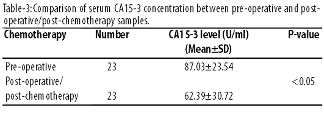 The preoperative CA15-3 values were significantly higher than the values after three cycles of chemotherapy (p<0.05) (Table-3).