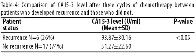 Six (26%) patients who developed recurrence exhibited a significantly higher CA15-3 level than the 17 (73.91%) patients who did not (Table-4).
