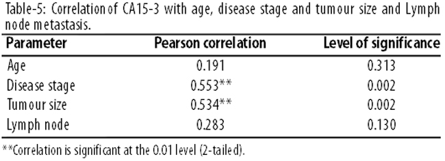 No correlation was found between CA15-3 level and patient\'s age or lymph node metastasis, but a highly significant correlation was found between CA15-3 level and the disease stage as well as tumour size (Table-5).