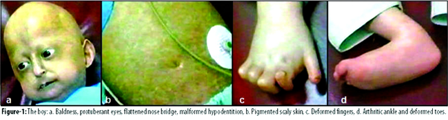 A 6-year-old boy (M.M.) from Peshawar was referred from the Children-B Ward of Khyber Teaching Hospital, Peshawar with presenting complaints related to chest infection for the preceding 6 weeks and symptoms of cardiac failure for 18 months. The features of abnormal growth and aging were noticed at 2.8 years (Figure-1).