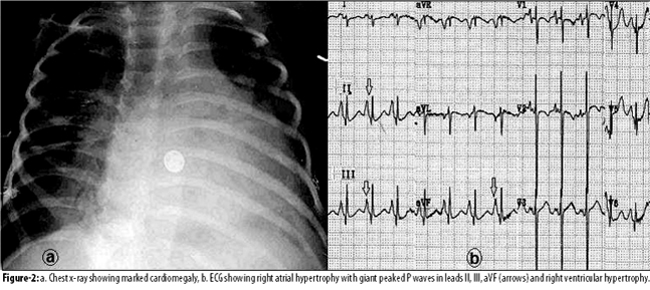 On examination, reduced height and body mass index (BMI), alopecia, prominent forehead, protuberant eyes, flattened nose bridge, deformed hypodentition, deformed mandible, and dry sclerodermic purpuric skin patches over the abdomen and limbs were observed. The hands and feet were small with malformed rigid fingers and toes. Hearing was within normal limits, but the boy was unable to speak. Pulse was 144 beats per minute and the blood pressure was 90/70 mmHg. Crepitations in the lung fields and a proto-diastolic gallop were audible. A short systolic (sclerotic) murmur was audible over the mitral and the aortic areas and signs of congestive cardiac failure were present. On laboratory investigations, haemoglobin was found to be 9.3 G/dl, urea was 47mg/dl, and serum cholesterol was 187mg/dl. Chest x-rays showed cardiac enlargement, and the electrocardiogram (ECG) showed right atrial hypertrophy with giant peaked P waves (leads II, III and aVF) and right ventricular hypertrophy (Figure-2).