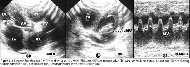 On 2D echocardiography, atherosclerotic dilated ascending aorta with sclerotic aortic valve (Vmax 188/second), thickened sclerotic mitral valve (MVA 1.3 cm2), and aortic and tricuspid valves with increased echo texture were recorded. Right and left atrial and ventricular dilatations and thickened speckled atrial and ventricular septa were recorded. M-mode showed thickened sclerotic mitral leaflets (Figure-3).