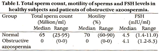 The subjects included in the study were selected from all patients referred to AFIP for investigation of male infertility from civil and military hospitals of Rawalpindi and Islamabad. They belonged to the heterogenous healthy male population and their ages varied between 22-45 years. A total of 81 subjects were seen. Out of these 25 (3 1%) patients of azoospermia were selected for this study on the basis of initial semen analysis and serum levels of FSH. The criteria for selection included: (1) patients who had regular, unprotected intercourse for atleast 12 months without conceiving and (2) patients who had azoospermia on semen analysis. All patients were thoroughly examined clinically to see any skeletal or endocrinological abnormality. Secondary sex characters like facial, axillary, pubic hair, voice and gynecomastia were noted. Other signs of disease like varicocele, torsion or absence of testis, epididymitis were noted. All the patients followed a similar protocol for evaluation.