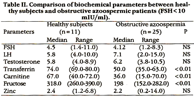 Levels of transferrin, carnitine and fructose were significantly lower in patients with obstruction azoospermia (FSH <1 0mlU/ml) than healthy subjects but there was no difference in FSH, LH and testosterone levels (Table II).