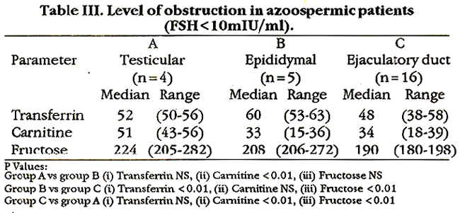 In group A, semen transferrin levels were below whereas those of carnitine and fructose were within the reference range. This signified obstruction before the epididymis. Group B consisted of patients with low levels of transferrin and carnitine but normal levels of fructose in their semen indicating post-epididymal obstruction. Group C had lower levels of all three parameters, i.e., transferrin, carnitine and fructose. This indicated a post-seminal vesicle obstruction.