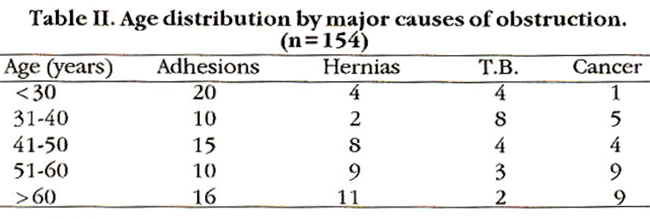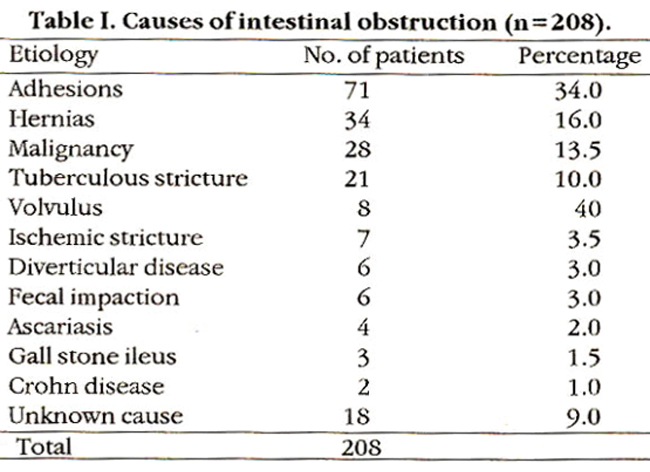 Of 208 patients, 108 were males and 100 females. Adhesions, hernias, malignancy and tuberculosis accounted for 74% of all the cases of intestinal obstruction (Table I).