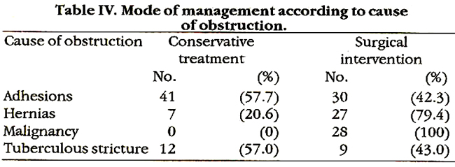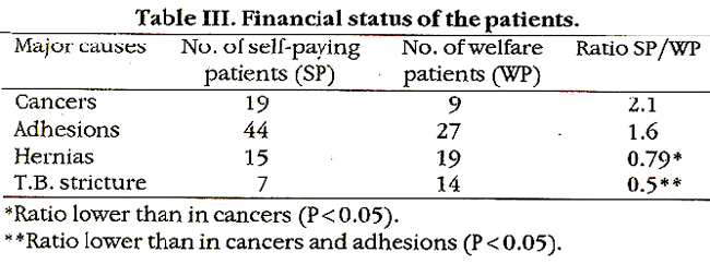 The ratio of self paying to welfare patients was significantly lower (P <0.05) for tuberculous obstruction as compared with adhesions or malignancy and for obstruction due to hernia as compared with malignancy. The need for surgical intervention was high in patients with cancer and external hernia. Only 43% of patients with adhesive obstruction and obstruction due to tuberculosis underwent surgery (Table IV).