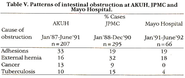 AKUH is a private hospital in Karachi where the majority of patients pay for clinical services. The pattern of intestinal obstruction at this hospital during the period January, 1987- June, 1991 was such that post-operative adhesions were by far the commonest cause accounting for a third of 208 cases and obstructed external hernias were next in frequency occurring in 16% of the cases. By contrast the Jinnah Postgraduate Medical Centre (JPMC) which caters for non-affluent class in Karachi serves as indigent population. The commonest cause of intestinal obstruction at JPMC during the period January, 1988-December, 1990, was external hernias accounting for a third of 295 cases while post-operative adhesions occurring in 19% cases, were next in frequency9 (Table V).