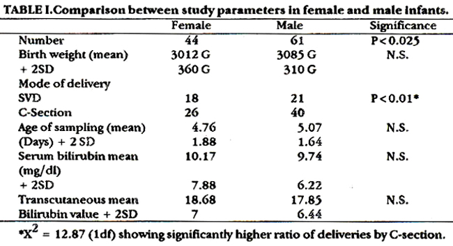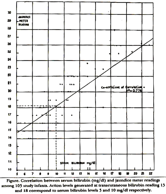 One hundred and five full term infants born at Lady Willingdon Hospital during five months period (November, 1991 to March, 1992) were studied. Sixty-six babies were delivered through C-Section for various indications and thirty-nine infants through vaginal route. Their gestational period was more than 37 weeks (expected as well as calculated) and they were not receiving phototherapy or exchange blood transfusion. They were brought from postnatal ward or selected by nursery personnel after screening for jaundice. Transcutaneous bilirubin readings were taken from forehead, chest and sternum by the same examiner (A.L.) within 30 minutes before blood sampling for serum bilirubin measurement and a mean value was determined for every patient. The meter readings when babies were not crying as crying may influence the meter readings by increasing the blood flow in skin. The yellow colour of the skin was measured with theAir Shields jaundice meter. This hand held instrument employs fibreoptic techniques to illuminate the skin and subcutaneous tissues and then spectrophotometrically analyses the intensity of yellow colour of the skin. According to manufacturer’s recommendation, battery was charged and then instrument standardized before its use on patients4. The total serum bilirubin concentration was determined by a standard diazo method. The coefficient of correlation between transcutaneous bilirubin readings and serum bilirubin concentration was calculated by drawing a regression line and then calculating sensitivity, specificity and positive predictive value at various serum bilirubin values used as a standard.