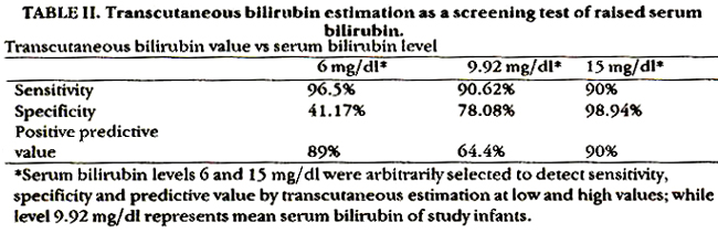 The sensitivity of transcutaneous bilirubin reading was found to be 90.5%, specificity 78% and positive predictive value 64% at mean serum bilirubin value of 9.92 mg/dl.
