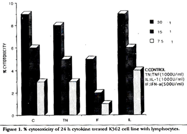 As shown in Figure 1 there was no significant difference in lysis of cytokine treated and untreated K562 cells by lymphocytes, lysis was less than 10% in all cases.