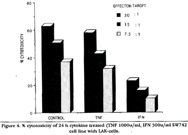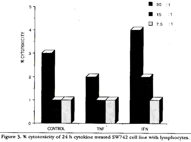 As it is shown in Figure 3 that there was no significant killing of SW742 cell line by lymphocytes nor there was any effect on killing by cytokine treated SW742 cells. Lysis was less than 5% in all cases.