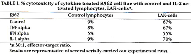 The LAIC cells were produced by IL..2 treatment of PBMC and were used as effectors in a 4 h 51Cr-release assay at a maximum effector to target ratio of 30:1 as before. There was about seven fold increase in lysis of K562 cells by IL-2 activated lymphocytes as compared to lysis by control lymphocytes (Figure 2, Table 1).