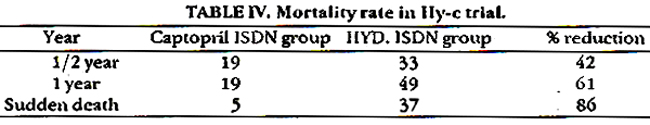 Previously conducted consensus trial did not show decrease in sudden death. Mortality rate was lower in enalapril group than hydrallazine ISDN group in 3 years of follow-up but mortality rate after 4 years was similar in both groups which suggested that vasodilators delay death but do not prevent progression of the disease16. Recently published hydrallazine captopril trial in Nfl-IA FC III, IV heart failure patients by Fonarow et al in JACC showed significant decrease in mortality (19%) in captopril group as compared to hydrallazine ISDN group (49%). This reduced mortality in captopril group was due to decrease in sudden death. One year incidence of sudden death in captopril treated group was 5% as compared to 37% in hydrallazine ISDN group (Table IV).
