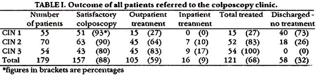 The age of the patients ranged from 18-78, mean age was 31.6 years. Fifty nine percent of the patients were under the age of 30 years. Eighty percent of the patients had no living children. Parity ranged from zero to nine, average being 1.6. Colposcopic examination was satisfactory in 157 patients (88%) and unsatisfactory in 22 patients (12%). Outpatient treatment with large loop excision of transformation zone under local anaesthesia was done in 105 patients (59%). Inpatient treatment with laser excision of transformation zone under general anaesthesia was carried out in 16 patients (9%). The total number of patients treated was 121 patients (68%) (Table I).