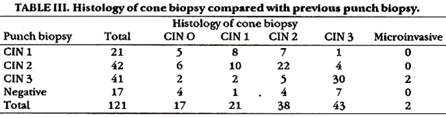 Punch biopsy, when compared with the final cone biopsy agreed in 91 patients (75%) with one degree above or below (Table III).