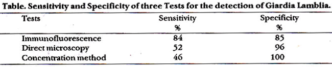 Table shows sensitivity and specificity of various methods. Immunofluorescence test appears to be more sensitive but less specific than concentration method for the detection of giardialambha.