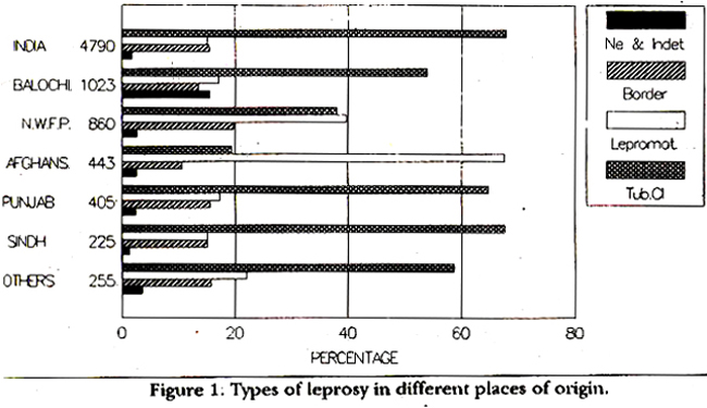It affected migrants from India, Punjabis, Sindhis and Balochis. Lepromatous leprosy was more common in Afghans. In Pathans from NWFP there was slightly higher frequency of lepromatous than tuberculoid leprosy (Figure 2).