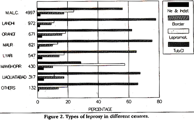 Place of residence was known in 7,929 cases. Majority of lepers reside. in Landhi, Orangi, Malir and Lyari. Migrants from Bangladesh have settled in Orangi andAfghans in Manghopir. Tuberculoid leprosy was commonly seen in all centres except Manghopir (Figure 1).