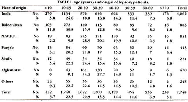 Karachi is a city in which people from different ethnic groups have settled in differentwaves of migration of 1947, 1971 and 1977. Large number of people have also moved to Karachi from other provinces in search of better jobs. In this retrospective study, Afghans were affected in the third decade with lepromatous type of leprosy. This may be due to suppression of immunity with advancing age as suggested by Browne. Sixty-eight percent of Indian migrants had tuberculoid form with only 15% developing lepromatous type. Pathans from NWFP were likely to be afflicted equally by either the lepromatous or tuberculoid type. The pattern of disease observed in residents of subcontinent and those from neighbouring Afghanistan may be due to genetic differences or variations in the immunological responses in different ethnic groups. The male to female ratio of 1.6:1 may not be a true representation of the distribution of leprosy, as examination of women is an arduous task due to cultural and religious constraints. The areas of city where most lepers live are Landhi, Orangi and Lyari. Manghopir being a hyperendernic area where all the lepromatous cases migrating from Afghanistan reside. Eradication should be aimed at these areas to control the spread of infection to other areas of Karachi.