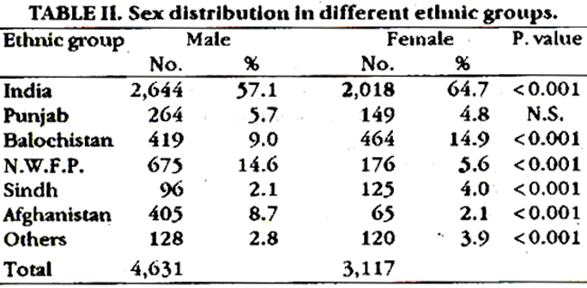 Male to female ratio was 1.6:1. Fifty eight percent males were of Indian origin. Predominance of females was significant in non- Biharis, Sindhis and Balochis and males in Afghans (Table II).