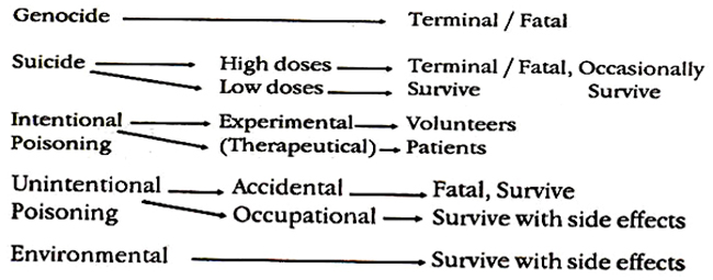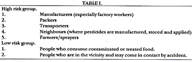 The entry of these pesticides in the body is by three routes, firstly oral (ingestion or drinking), secondly dermal (through the body contact) and thirdly inhalation (fumes). Individuals exposed to pesticides can be categorized into two major groups, i.e., high and low risk’ groups (Table I).