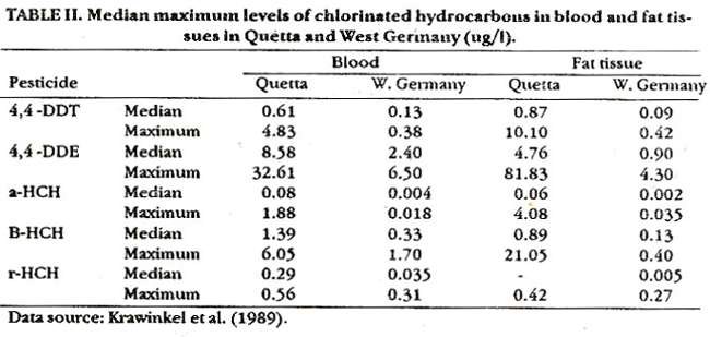 Organ chlorine residues are detected in measurable concentrations in various tissues of human beings because of the worldwide pollution of air, water, soil and foods. The concentrations vary from region to region according to chemical, climatic, socio- economic and geographic factors. Polluted air is carried over huge distances4 and some chemicals are found almost worldwide, e.g., hexachlorobenzene (HCB), which has been used as fungicide and is mainly emitted by chemical industries now5. In a study conducted in Karachi area by Mughal and Rehman6 more than sixty samples of human adipose tissue from the general population were analyzed for chlorinated compounds by colorimetric and chromatographic procedures. The average level of total DDT-equivalent was 25 ppm, total benzene hexachloride (BHC) was 0.48 ppm and dieldrin was 0.047 ppm. Values varied widely and the frequency distribution was positively skewed. The tendency towards lower concentrations in females was due, perhaps, to their greater fatty pool distribution of residues. The concentration of p,p -DDD, an intermediary of DDT metabolism, was definitely higher in autopsy as compared to biopsy material due, probably, to post-mortem anaerobic microbial metabo Krawinkel7 conducted a survey monitoring the organochlorine concentrations in human blood and fat tissue of patients of the Sandeman Provincial Hospital in Quetta, Balochistan (Table II).