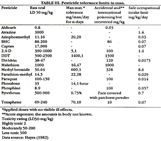 Table III gives the amount of pesticide which was either accidentaly consumed and the patients survived or deliberately given to volunteers and no ill-effects were observed. It also gives the values or limits which are supposed to be safe for the pesticide workers. Of course individuals would differ in susceptibility.