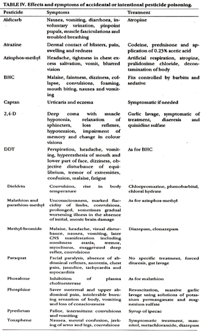 Table IV gives the symptoms which appeared after accidental or intentional exposure to larger amounts of pesticides. The treatment given is the one which was administered to these individuals and they recovered. In addition to the medical symptoms the laboratory studies on rats and other primates have shown that long term exposure to pesticides can lead to mutagenic, teratogenic, carcinogenic and hepatotropic effects.