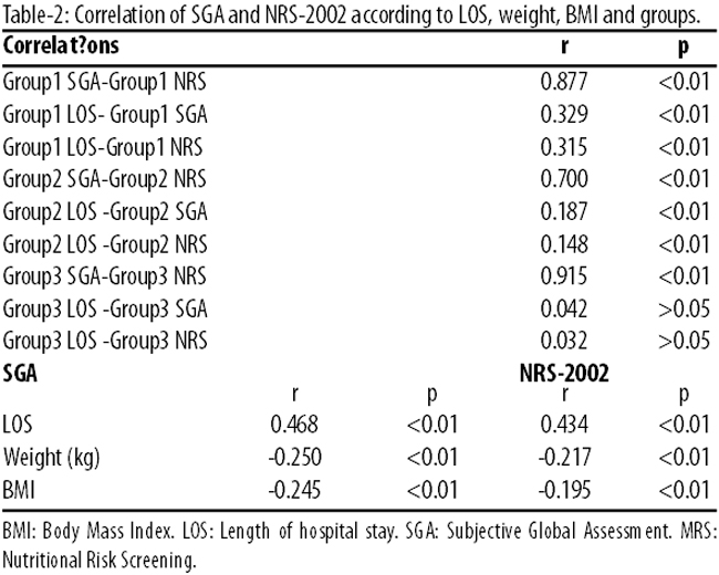 One study reported the rate of malnutrition of hospitalised patients at a range of 20-62% and the results gathered with SGA increased the degree of malnutrition significantly compared to NRS-2002. It stated that SGA might be calculated differently by different clinicians, and it is very user-dependent.19 In our study also, the reason of difference among SGA levels at admission to hospital could have resulted from differences among the appliers. The correlations between SGA and NRS-2002 were found to be statistically significant in predicting complication in all groups. A study reported that malnutrition rate was 38 % by SGA and 28 % by NRS-2002 in a study population of 705 patients. It stated that the two methods were complementary to each other in showing hospital stay, mortality and complications.20