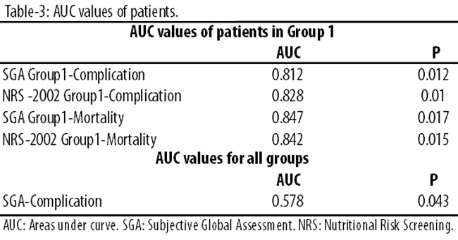 SGA and NRS-2002 were found to have successful predictive power in estimating the mortality risk in general surgical patient population, according to the AUC values (Table-3).