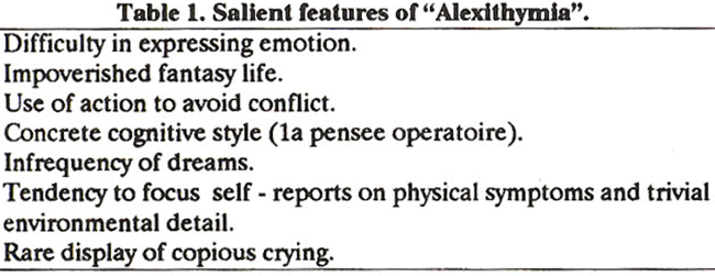 Alexithymia literally means no words for mood and is used to describe a group of patients who have impoverished fantasy lives and difficulty in expressing their feelings in words1. They dream rarely and tend to focus on physical symptoms and trivial environmental details. They rarely cry and exhibit an operative style of thinking which is concrete, inert and stimulus-bound (Table-I).