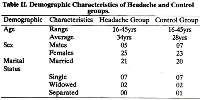 The average age of the experimental group, which we will call the “headache group” was 34 years, while that of the control group was 28 years. There were 5 males and 25 females in the headache group and 7 males and 23 females in the control group (Table II).