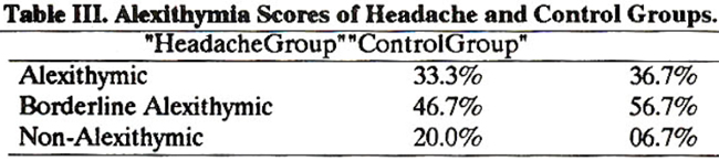 Ten out of thirty (33%) from the headache group were found to be alexithymic as compared to eleven (37%) in the control group. Fourteen patients (47%) from the headache group turned out to be borderline alexithymic as compared to seventeen (58%) from the control group. Six (20%) subjects were nonalexithymic from the headache group as compared to only two (7%) from the control group (Table III).