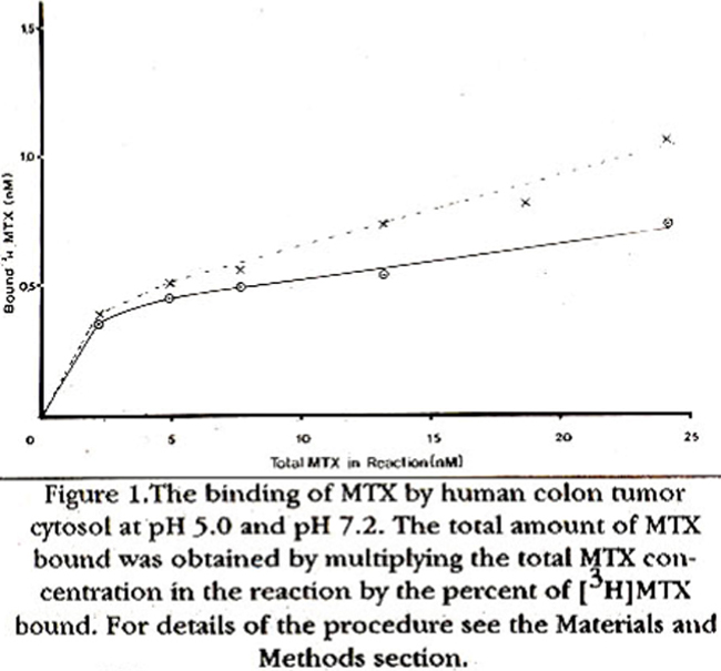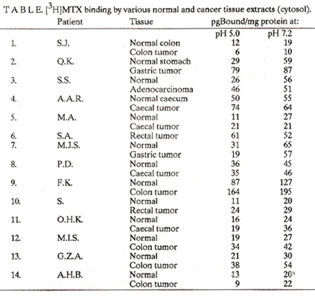 [BH]-methotrexate binding at pH 5.0 and pH 7.2 by the cytosol of tumor tissues and the surrounding normal areas of the gastrointestinal tract of patients suffering from colon or gastric cancer has been used to identify In these cells the presence of a binder of methotrexate having low-affinity for this drug in addition to the enzyme dihydrofolate reductase. Scatchard analysis of the [3H]- methotrexate binding data by a colon tumor sample also reveals that there are two binders of this drug present In the cytosol of these cells. The association constant (Kass) for one binder of methotrexate is = 5.6 x 10 M1 while the Kass for the second binder is = 1.0 x 106 M1. The two binders do not differ very much in their apparent molecular weight. Upon isoelectric focusing, the tumor cell cytosol resolves into 4 major isoproteins each having the ability not only to bind [ H]- methotrexate but also reduce [H]-pteroylglutamic acid to H]- tetrahydropteroylglutamic acid. This suggests that the two binders of methotrexate may be the two forms of dihydrofolate reductase having different affinities for this anticancer drug(JPMA 41:136, 1991).