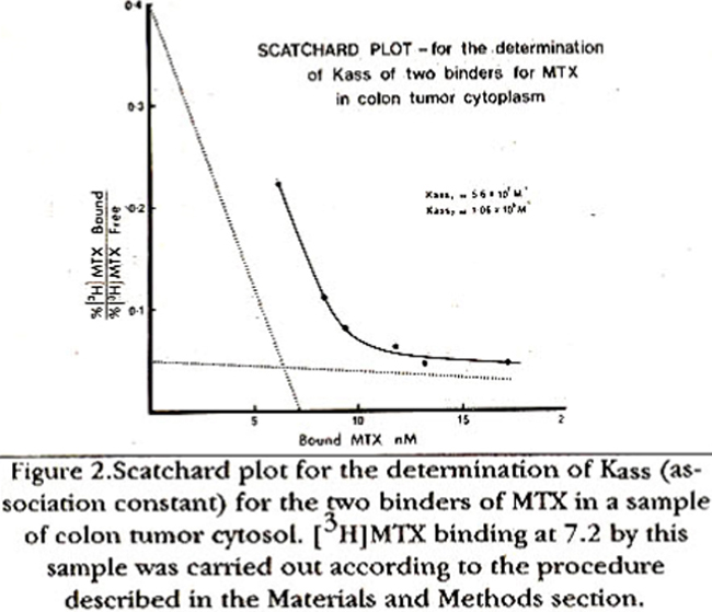 Figure 2 shows that one of the binders of MDC had an association constant (Kass) = 5.6x 107 M-1, while the other one had a Kass = 1.06x 106 M-1. These values are close to the two Kass values reported for the two binders of MTX in human leukemia cells7. We could not separate the two binders of MTX by gel-filtration chromatography because a single peak of [3H]MTX binding vas obtained when colon tumor cytosol was applied to Sephadex G-75 column suggesting that the two binders may not be differing much in their apparent molecular weight which appears to around 20,000 (Figure 3).