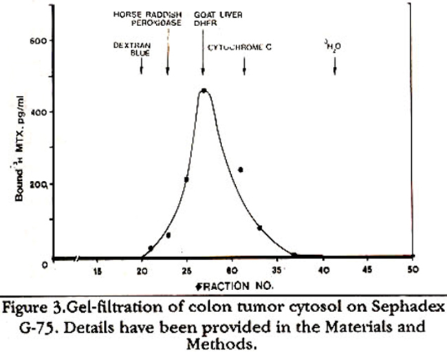 Sephadex G-75 was equilibrated with 0.05 M TrisHCI buffer, pH 7.4, containing 0.02% sodium azide and packed in a column of size 0.7 cm x 50 cm. Half ml of colon tumor cytosol was applied to the column and eluted at a flow rate of 4.8 mI/hr. Fractions in a volume of 0.5 ml were collected and assayed for [3H]MDC binding at pH 7.2. Dextran blue, pure goat liver DHFR (Mr 20,000), horse raddish peroxidase (Mr 40,000), cytochrome C (Mr 12,400) and3H2O were used as column markers.