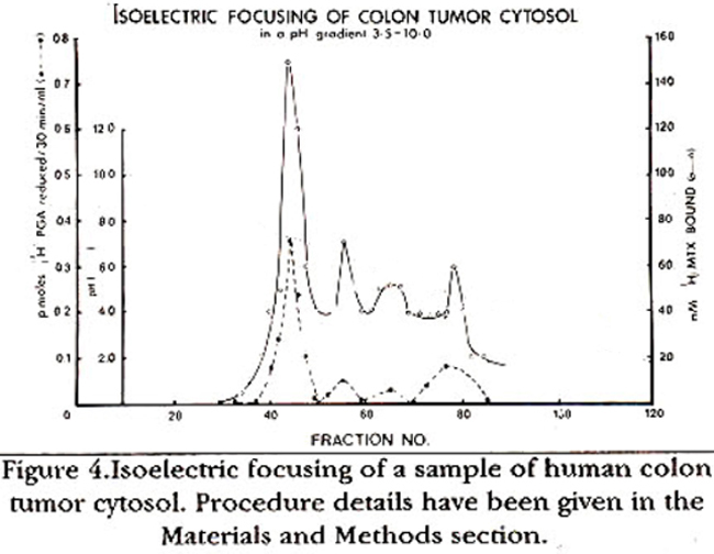A colon tumor cytosol sample was analyzed by isoelectric focusing in a standard LKB 1 10-mI column packed with 1% (W/V) ampholytes at a pH range of 3.5 10 in a zero to 50% sucrose gradient. The sample (1 ml) was dialyzed against distilled water for 4 hrs to remove electrolytes prior to application to the column. The dialyzed sample and the 75% of total ampholytes used were added to the solution which was adjusted to contain 50% sucrose (“dense solution”). The remaining ampholytes (25%) were mixed with “light solution” comprising of 5% sucrose. The electrode solution for the cathode (25 ml) was 0.262 M. ethanolantine in 60% sucrose. The electrolyte solution for the anode (20 ml) was 0.173 M H3P04 prepared in distilled water. A fraction of this solution, enough to completely cover the respective electrode was placed on top of the column. The column was run for 20 hrs at a maximum power of 5W with the maximum voltage set at 1.6 KV. Two mgs. of pure hemoglobin was added alongwith the sample as a marker for focusing. The column was eluted at a constant flow rate of 100 mI/hr and 0.9 ml fractions were collected. Every other fraction was dialyzed against 0.025 M potassium phosphate buffer, pH 7.4 containing 0.025 M potassium chloride for 20 hrs to remove Ampholines and then analyzed for [3H]MTX binding12 and for the reduction of [3H]PGA to [3H]-tetrahydro-PGAB.