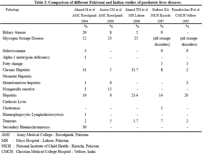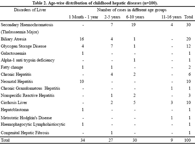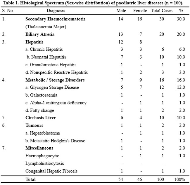 Results: During four years period, a total of 100 cases with age range of 1.5 months to 16 years were studied. The most common histological findings in order of frequency were secondary haemochromatosis (30%), biliary atresia (20%), storage disorders (16%), cirrhosis of liver (10%) and neonatal hepatitis (10%). The less common entities were chronic hepatitis (6%), nonspecific reactive hepatitis (3%) and granulomatous hepatitis (1%). One case each of hepatoblastoma, haemophagocytic lymphohistiocytosis and congenital fibrosis was also noted. These findings have been compared with local and international histological studies.