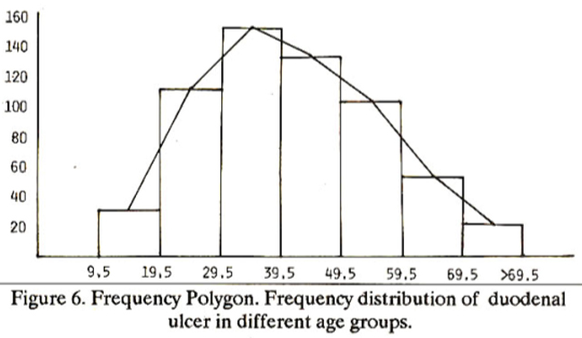 Some times a frequency is also used to graph a frequency distribution. It is like a histogram in its vertical and horizontal scales. It is drawn by connecting the middle points of upper bases of the histogram bars. The middle points are joined by means of a smooth free hand curve. The curve in most of the cases is bell shaped (Figure 6).