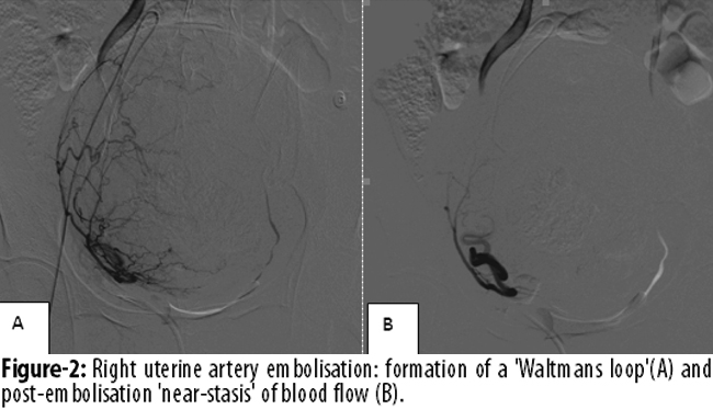 In case of severe tortuosity and difficult catheterisation, a micro-catheter was used to avoid vasospasm. Finally, 500-700µm and 300-500µm polyvinyl alcohol (PVA) particles were slowly infused into the artery and "near-stasis of flow" in uterine arteries was considered the end point of the procedure.