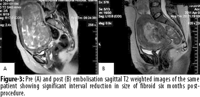 Methods: The retrospective study was done at the Department of Diagnostic and Interventional Radiology, Shifa International Hospital, Islamabad, and comprised records of 12 patients with symptomatic uterine fibroids who had undergone uterine fibroid embolisation with the use of polyvinyl alcohol between May 2008 and July 2012. All of these patients had been assessed by a gynaecologist. Pre-embolisation workup was done by pelvic Magnetic Resonance Imaging. A detailed questionnaire was prepared to assess clinical improvement and interval change in fibroid size on follow-up imaging.